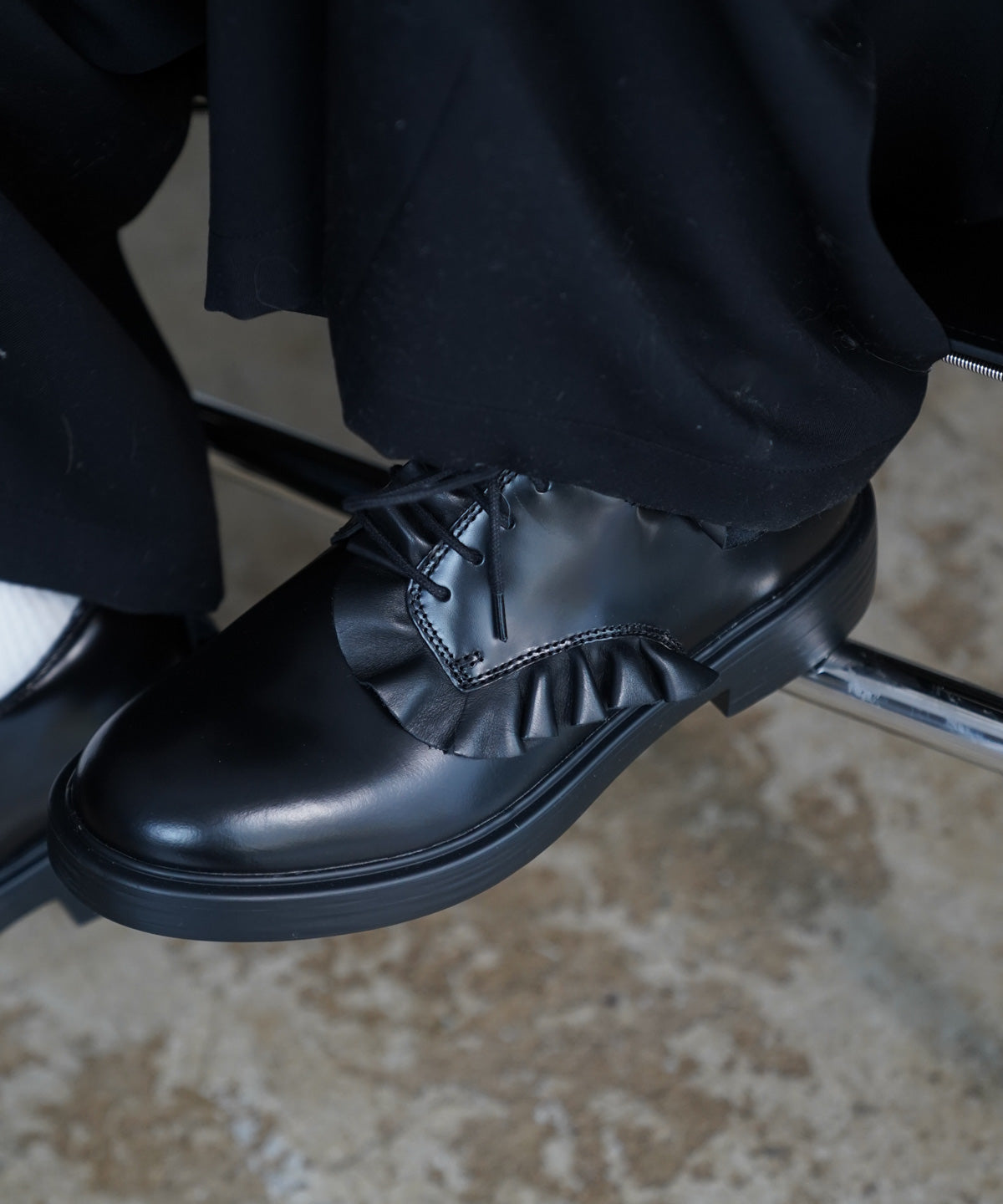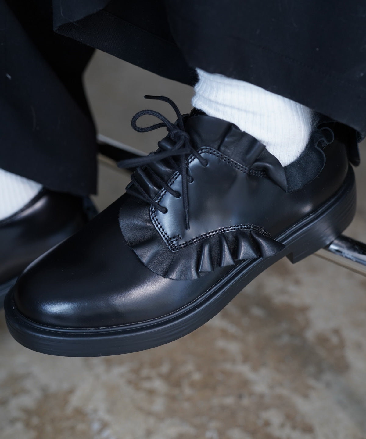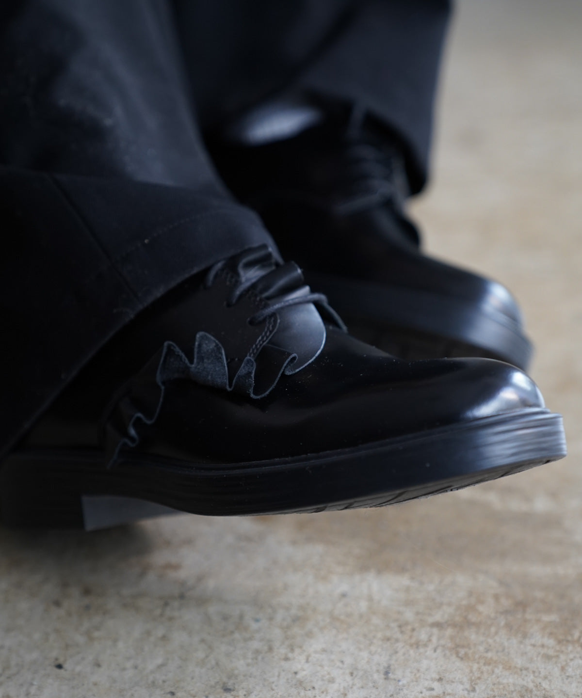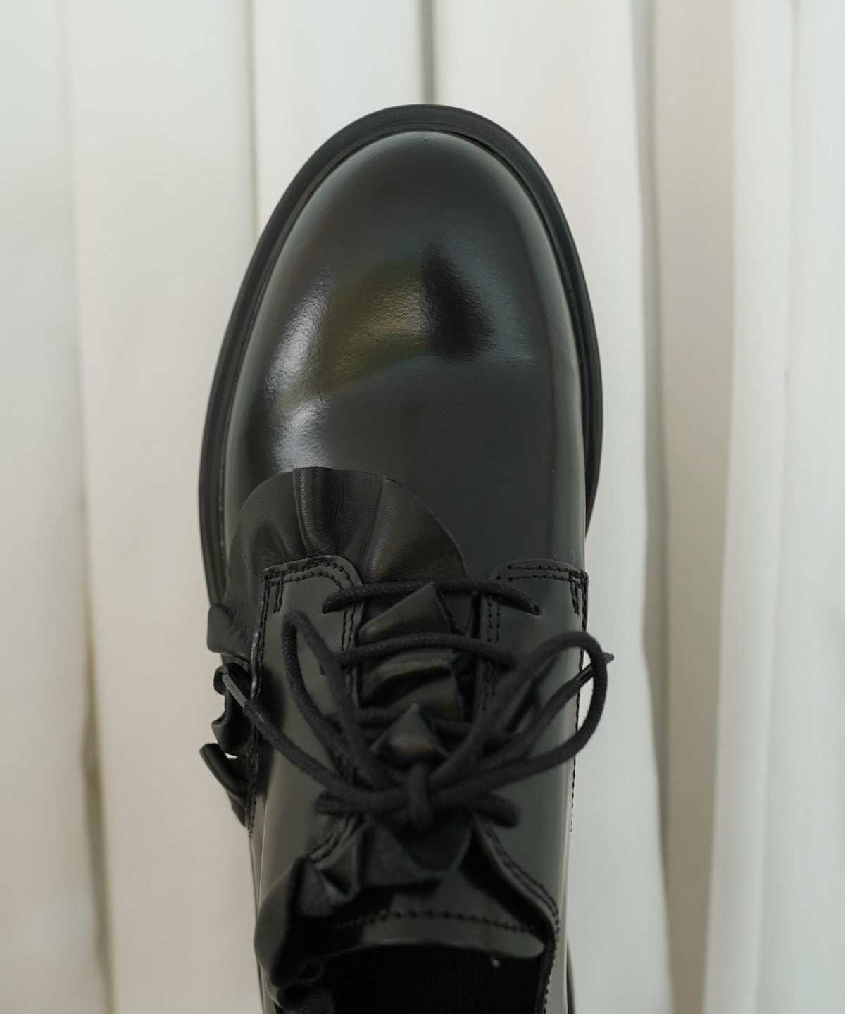 フリルドレープを施したスペシャルなレザーシューズ。