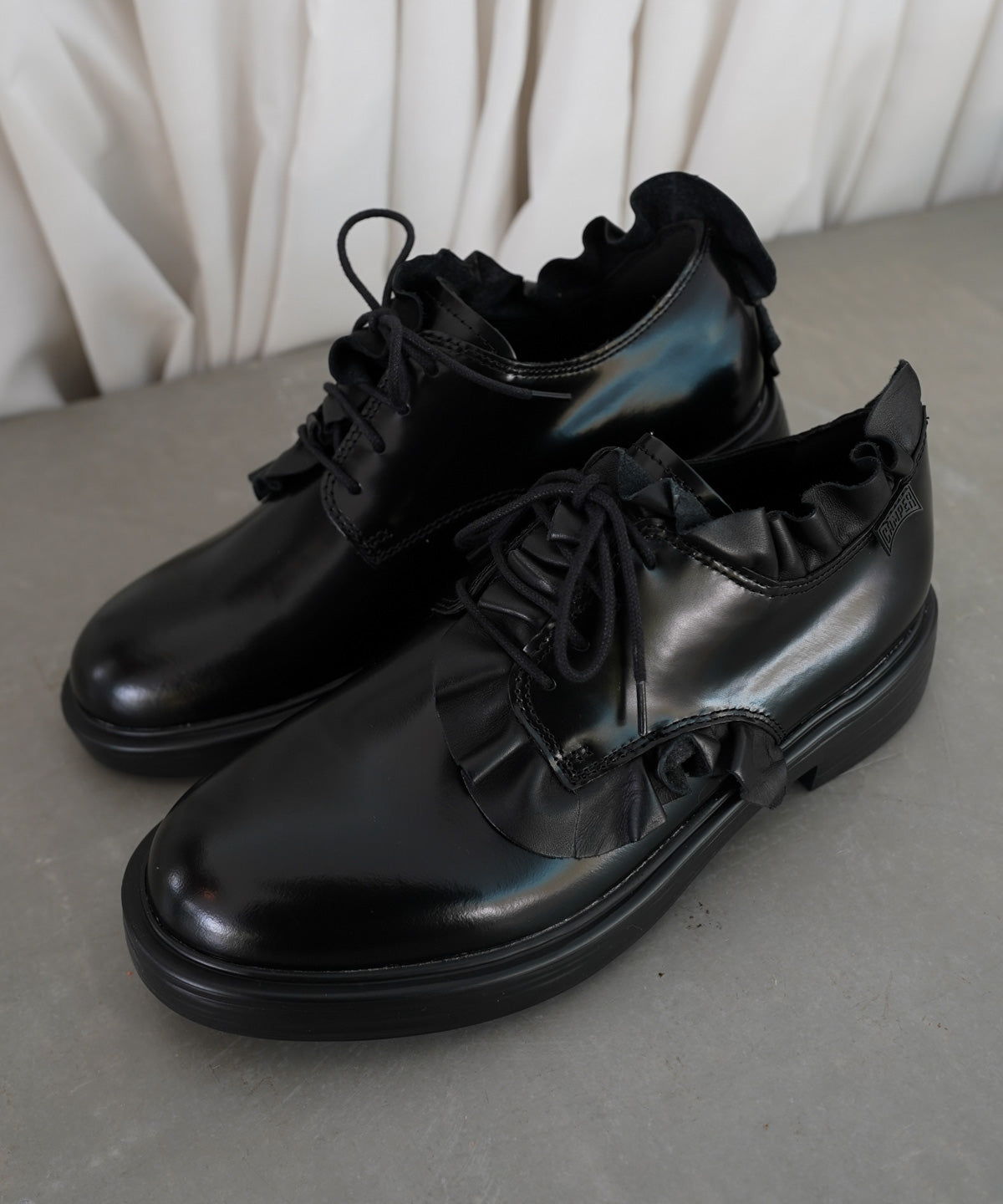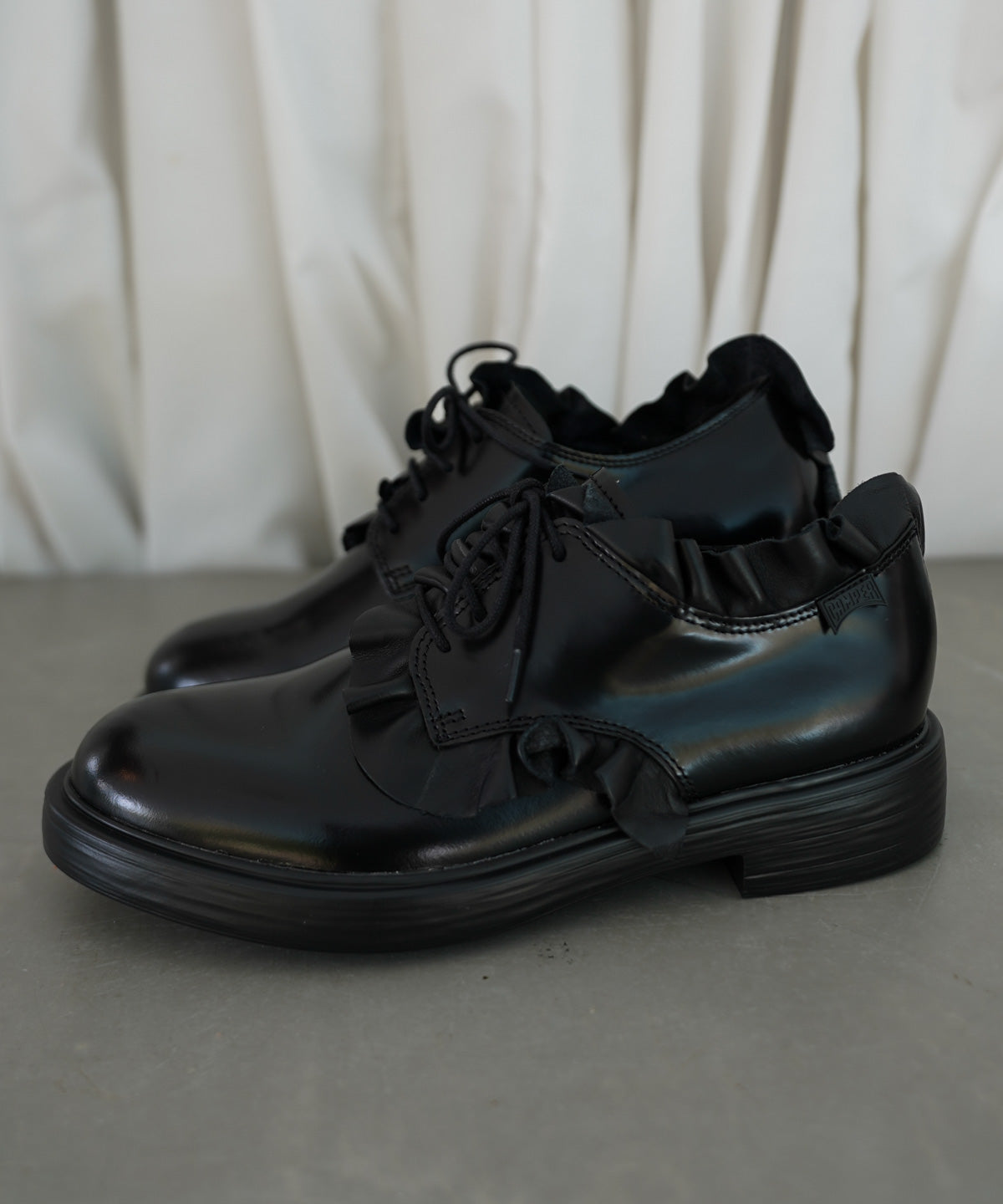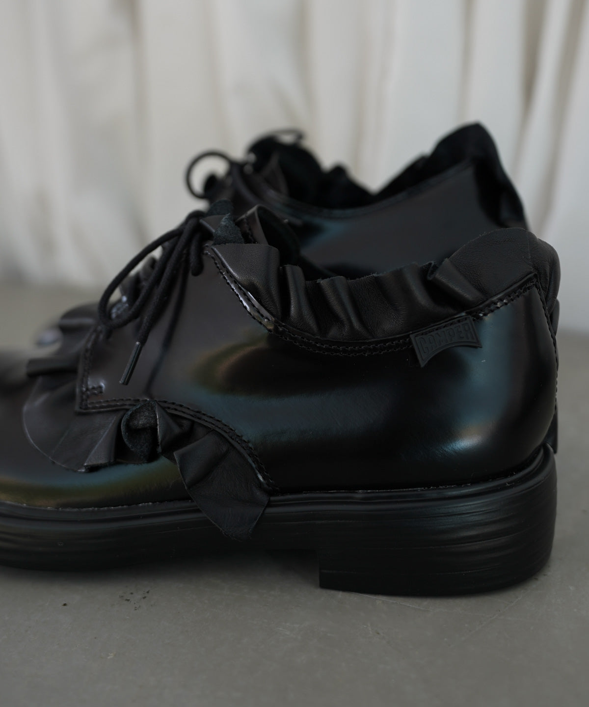 フリルドレープを施したスペシャルなレザーシューズ。