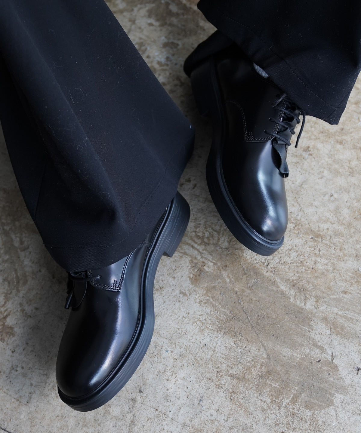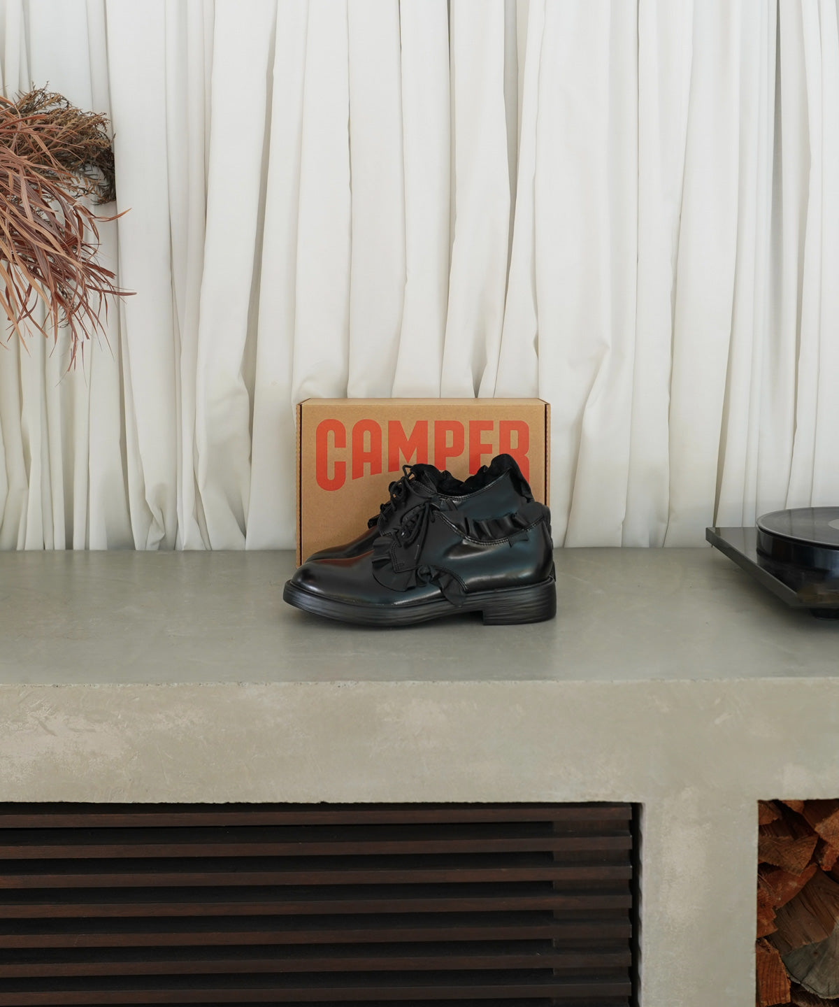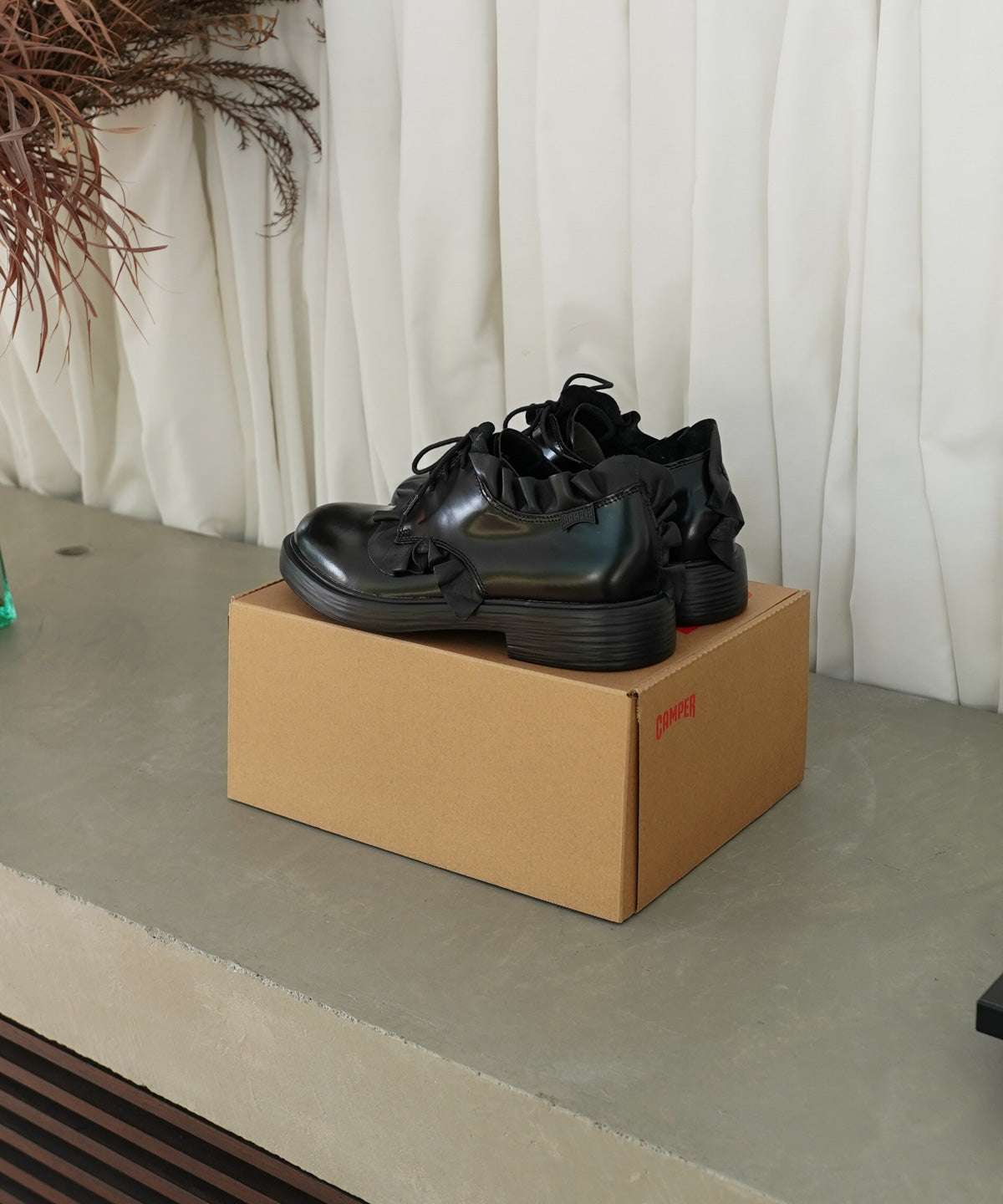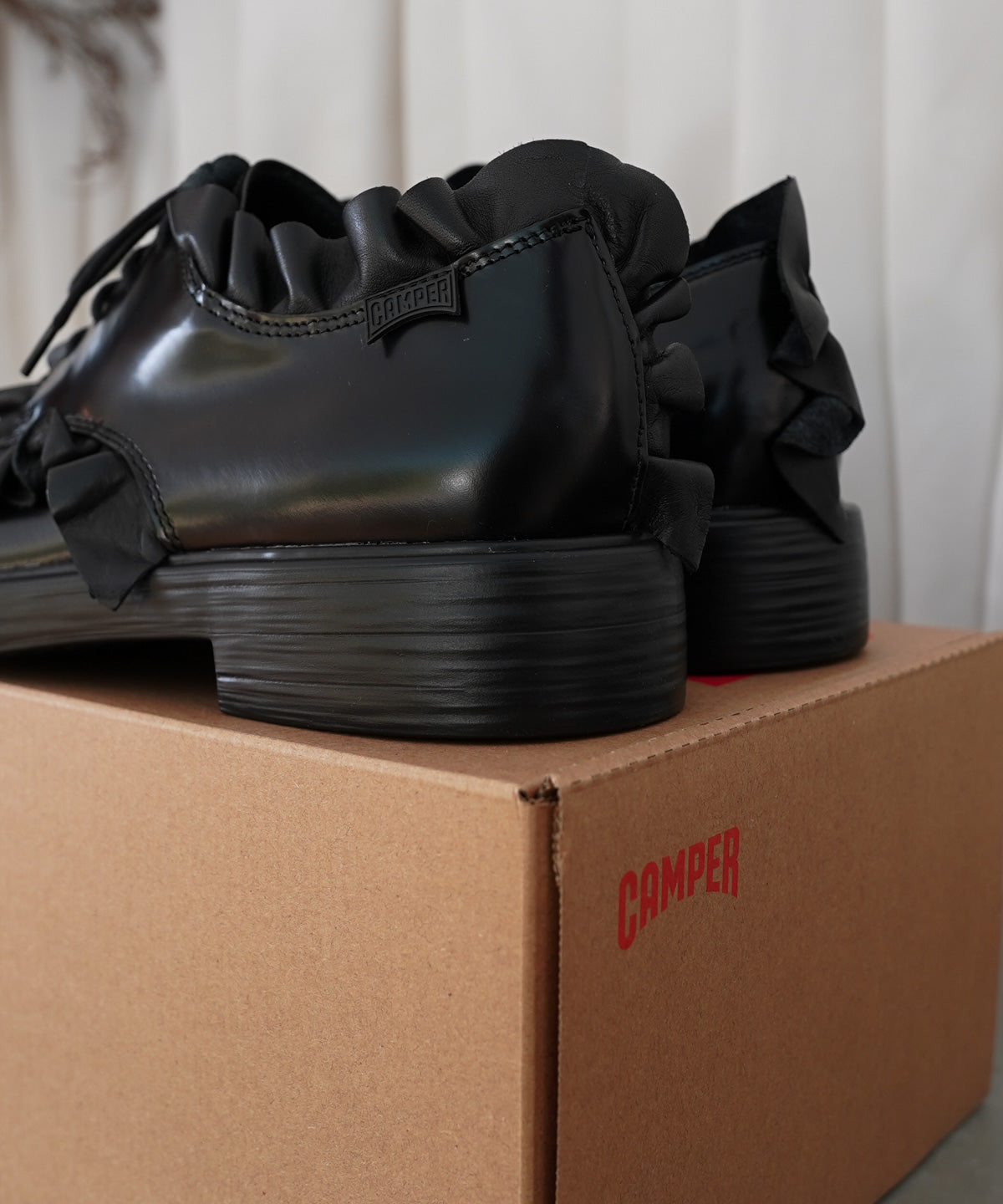 フリルドレープを施したスペシャルなレザーシューズ。