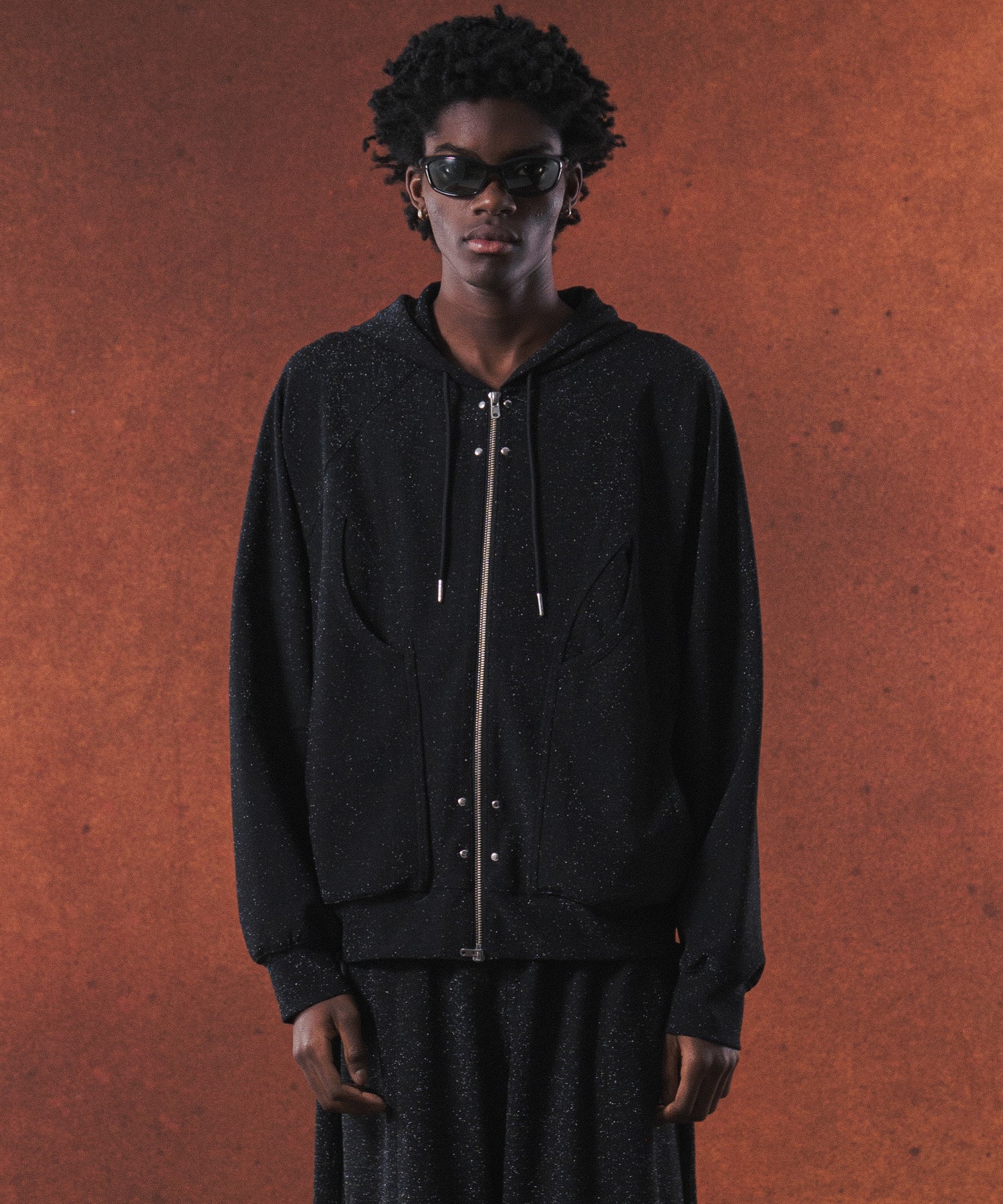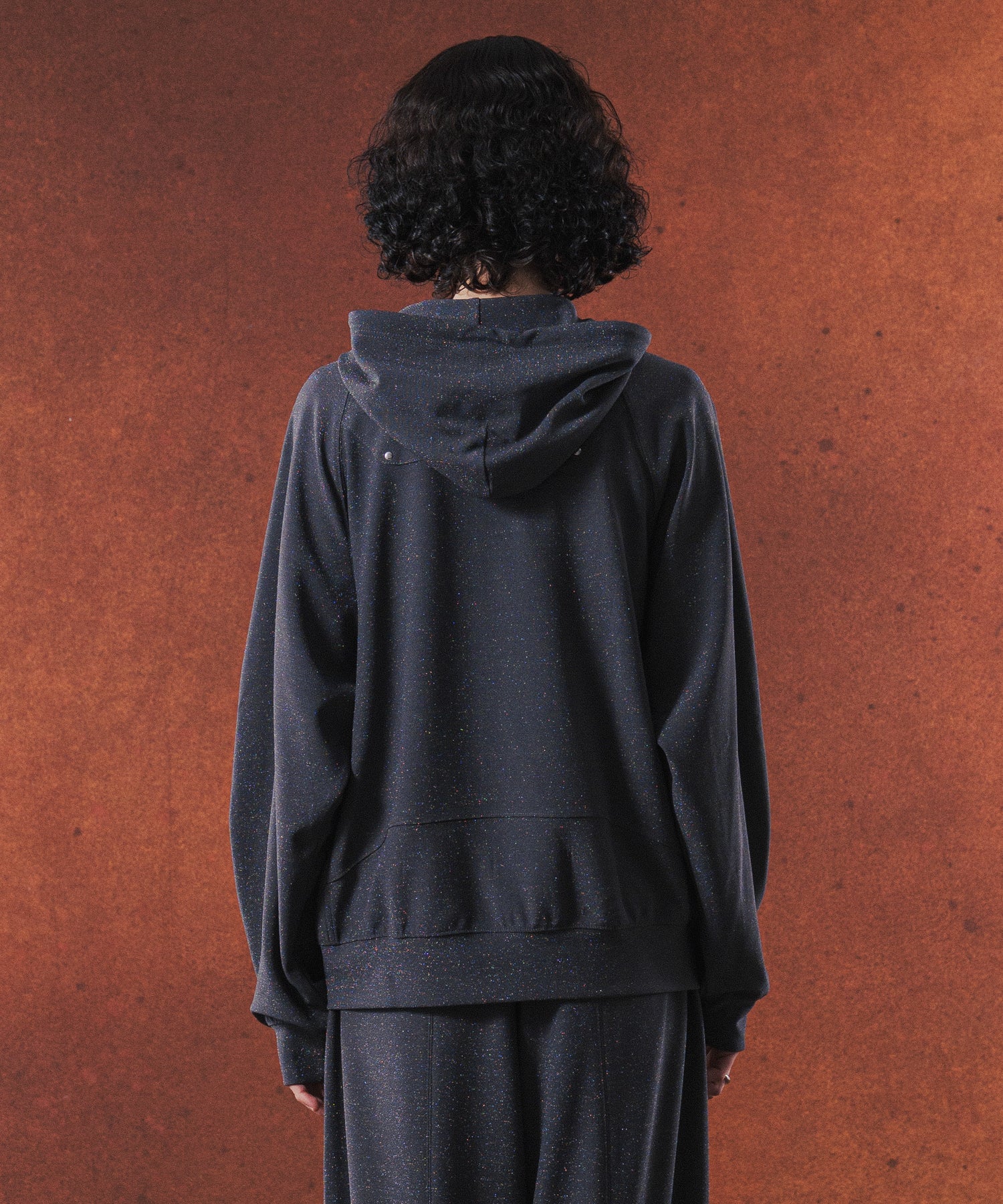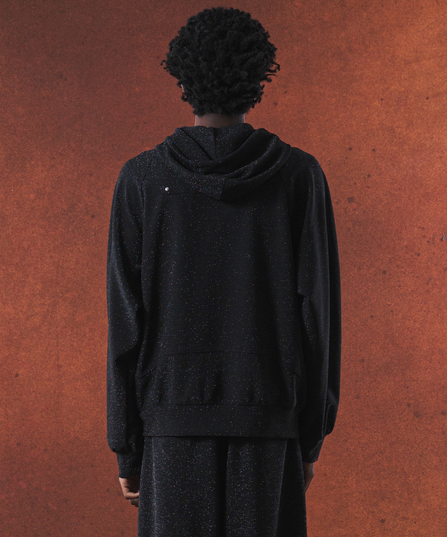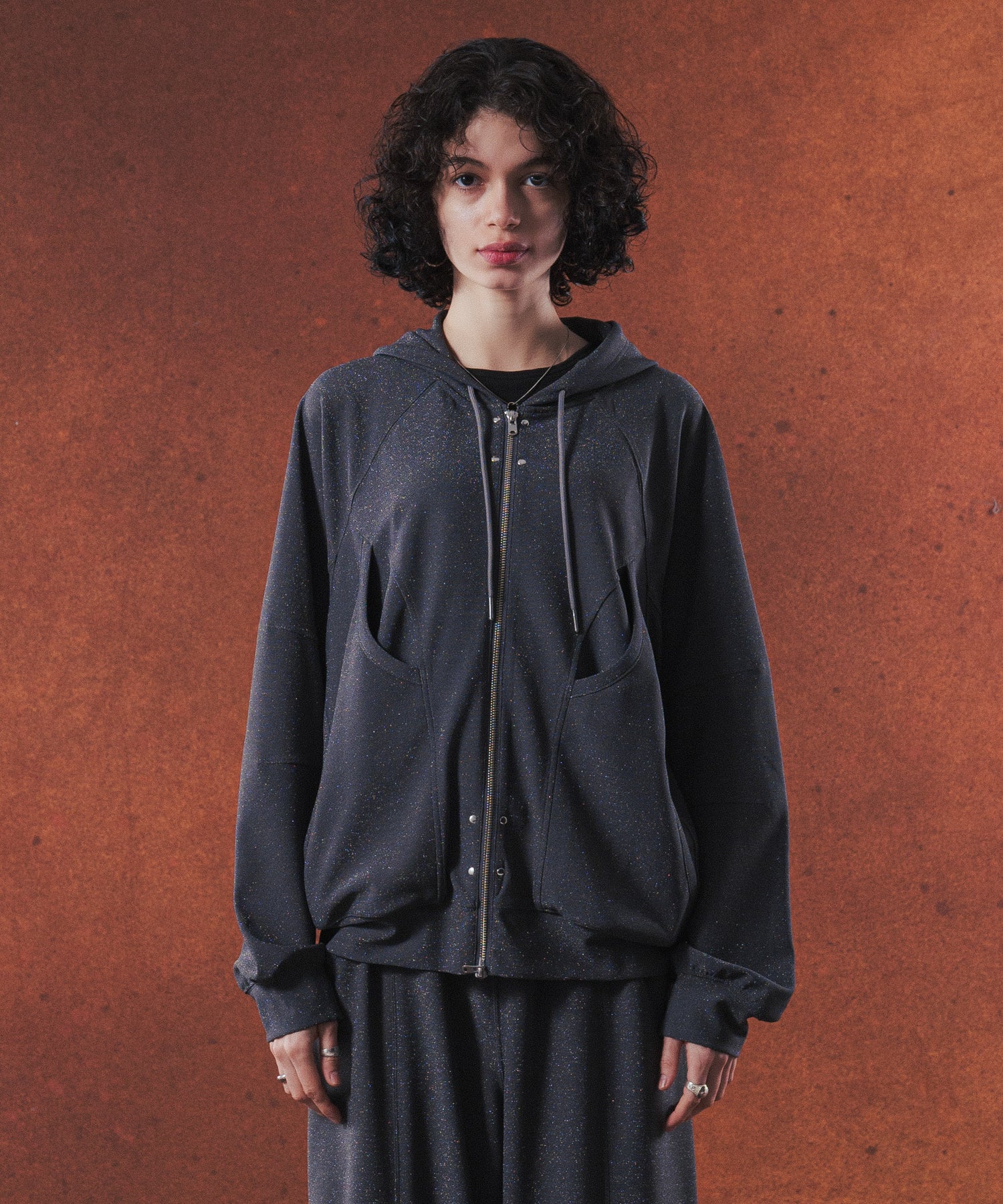 素材には微光沢のあるラメ糸をブレンドしたジャージ生地を採用。
