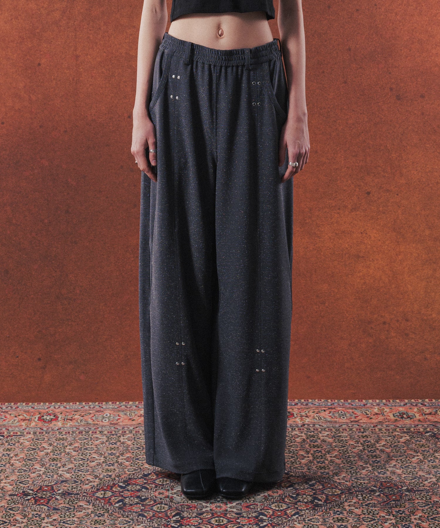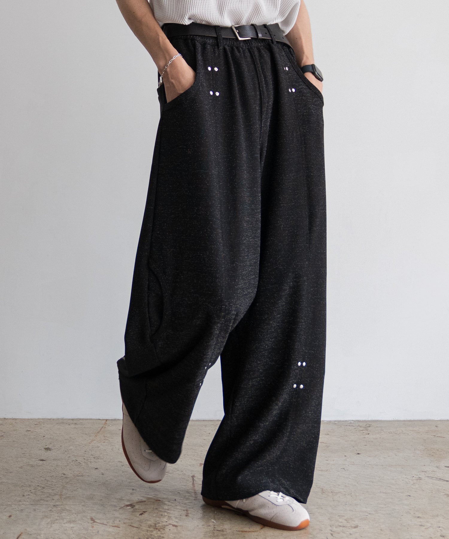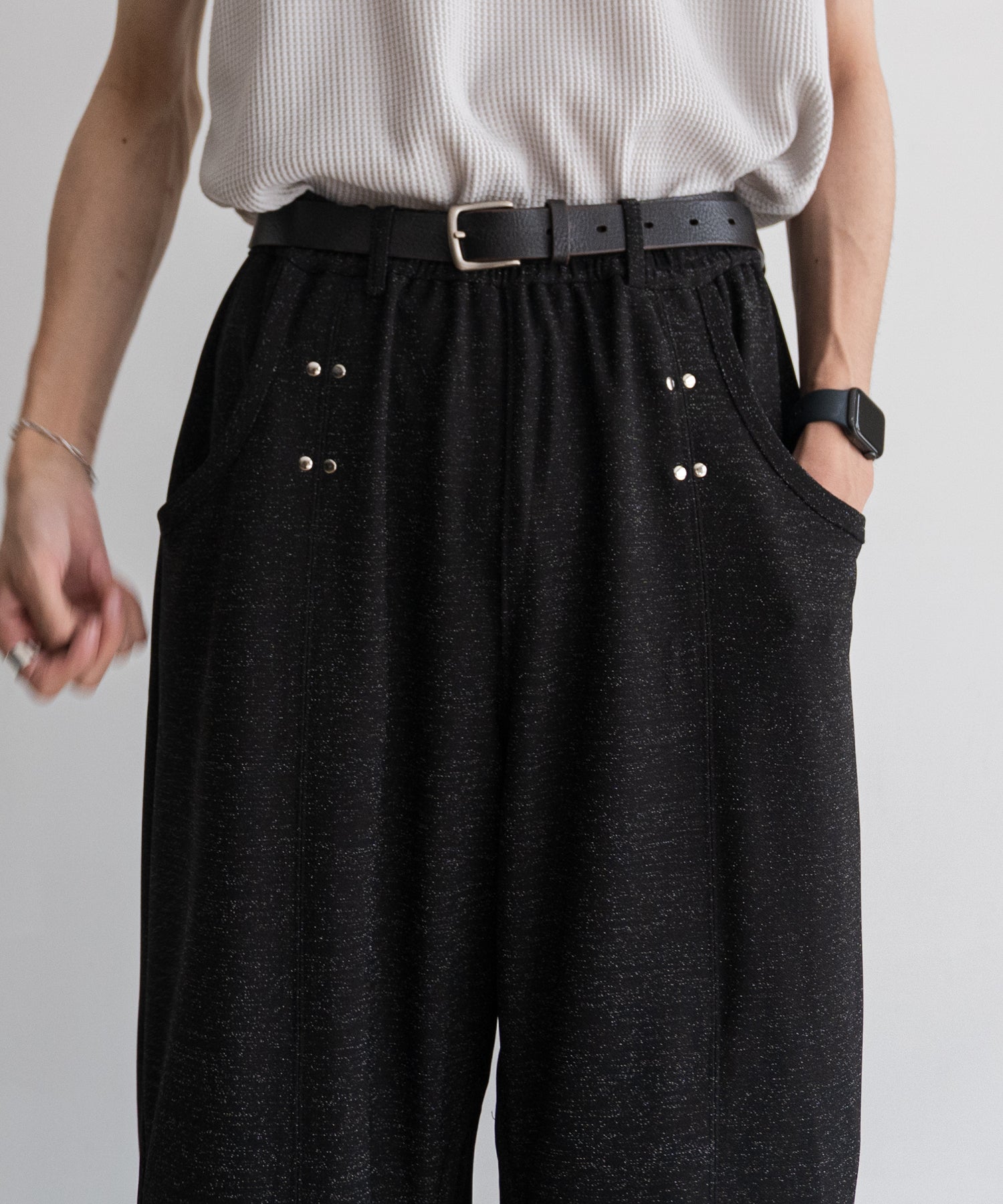 ウエストは一周ゴムを配したイージー仕様で、メタルリベットを部分的にあしらうことで上品さと程よいアクセントをプラス。