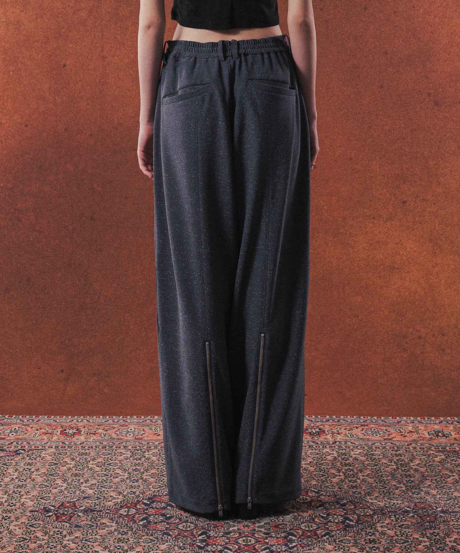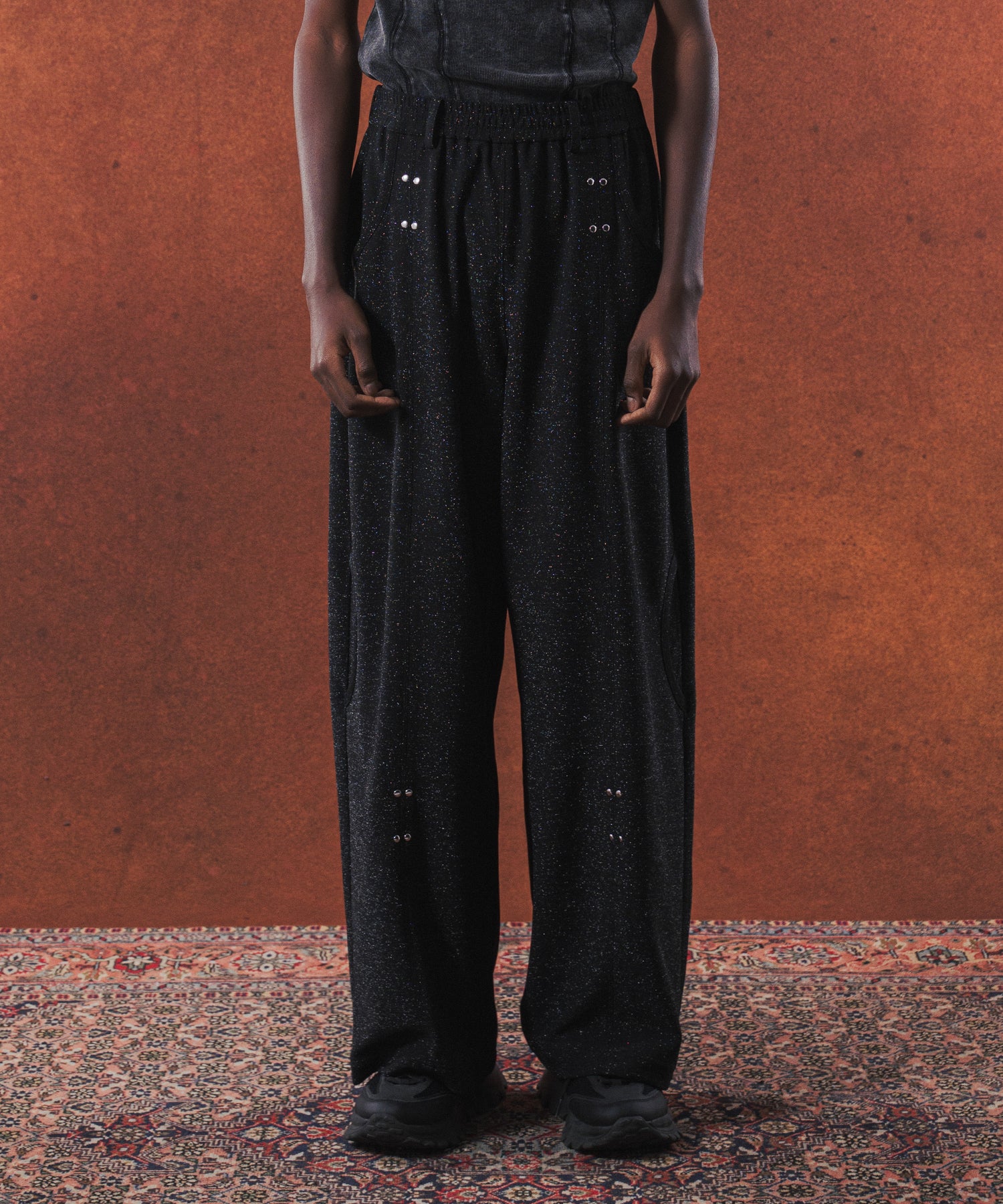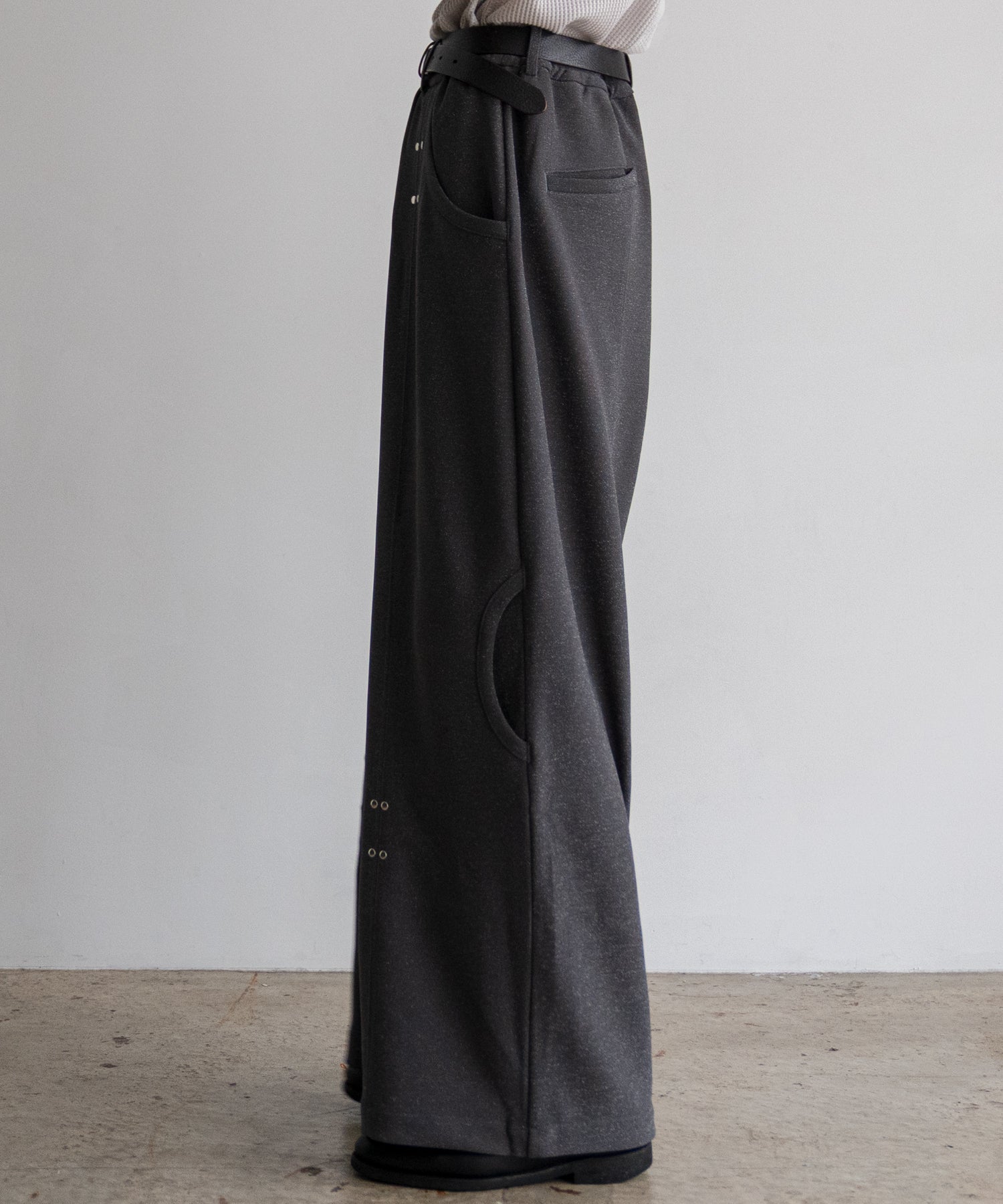 ウエストは一周ゴムを配したイージー仕様で、メタルリベットを部分的にあしらうことで上品さと程よいアクセントをプラス。