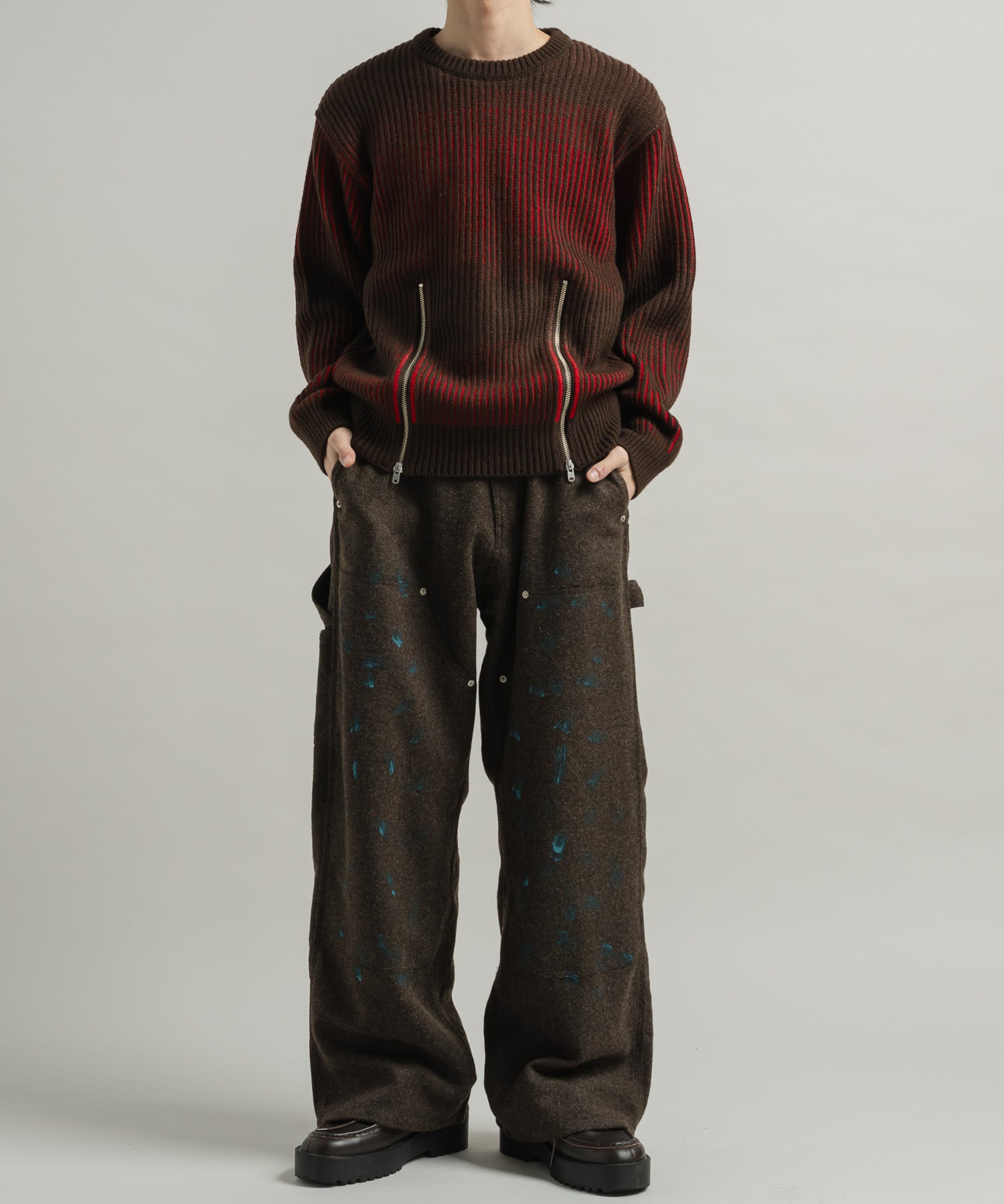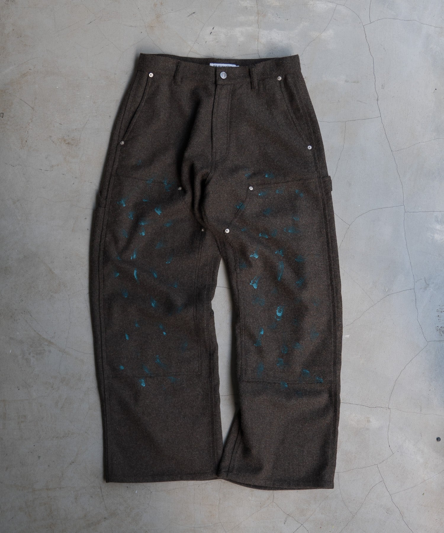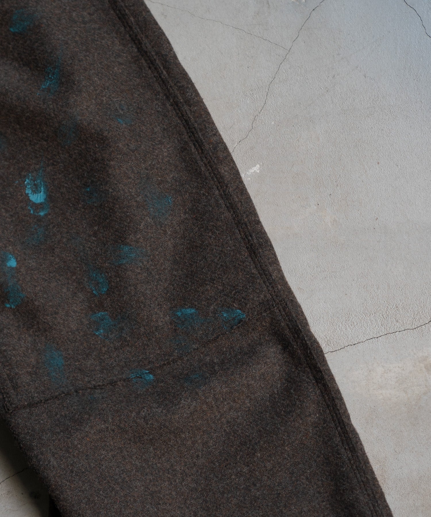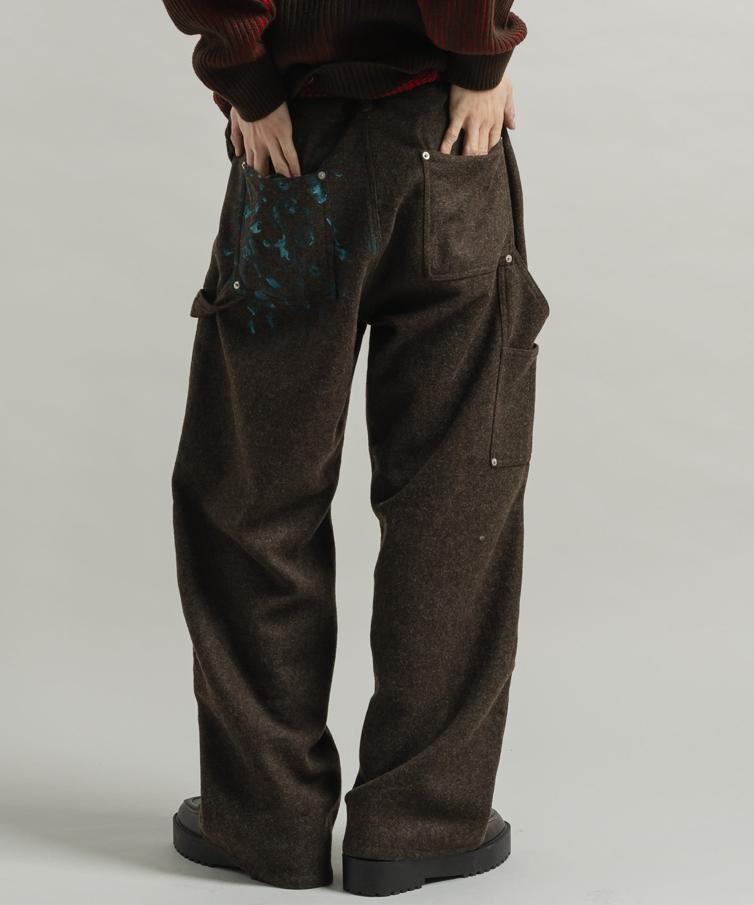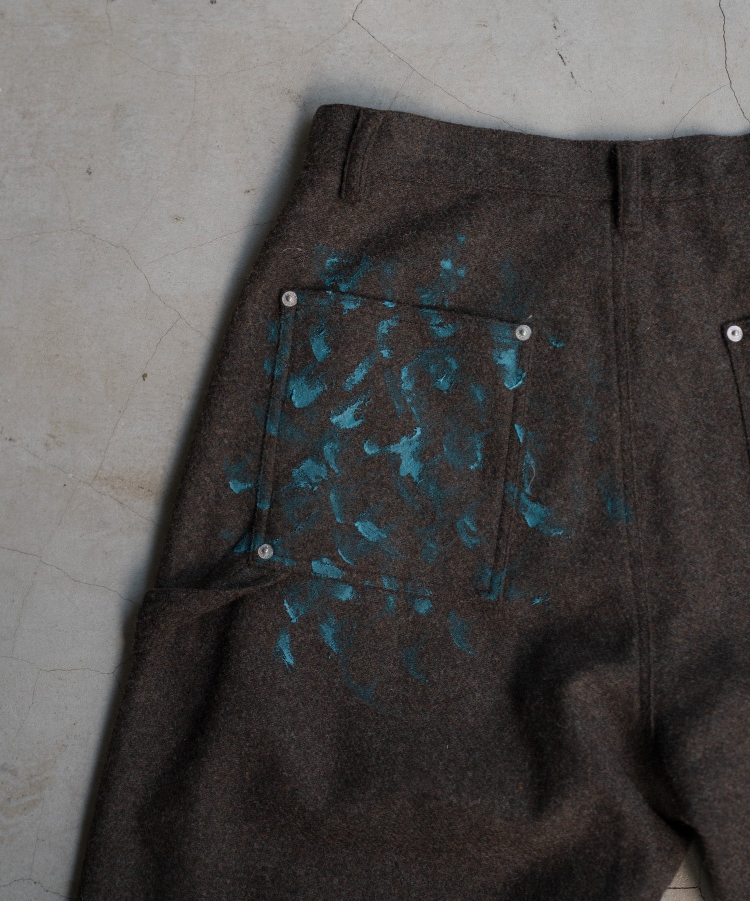 過去のあらゆる出来事を受け入れながらも、前へ進む“美しい後ろ姿”をテーマに制作されたウール混メランジのペインターパンツ。
