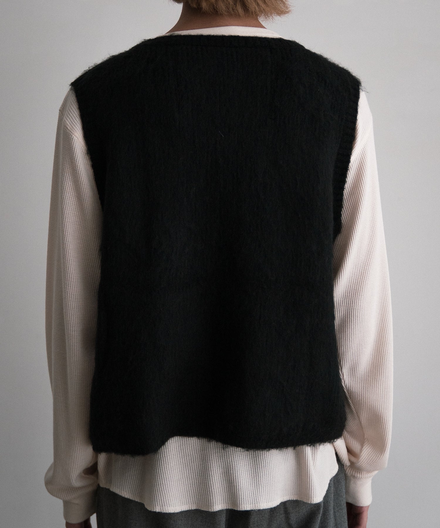 素材はリサイクルポリエステルをベースにモヘアをブレンドした糸を使用し、軽さとハリに加えてモヘア特有の長い毛足の柔らかさを併せ持つタッチに。