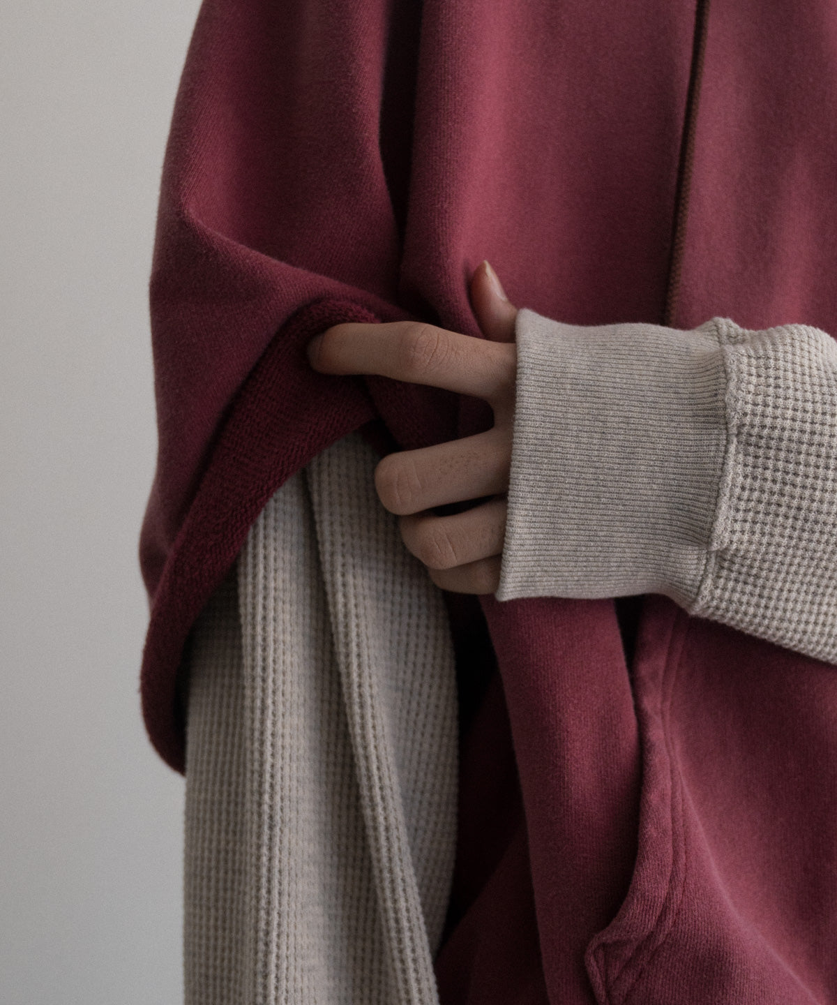 袖およびフード裏には空紡糸のサーマル素材を使用し、凹凸のある編み地がアクセントと保温性をプラス。
