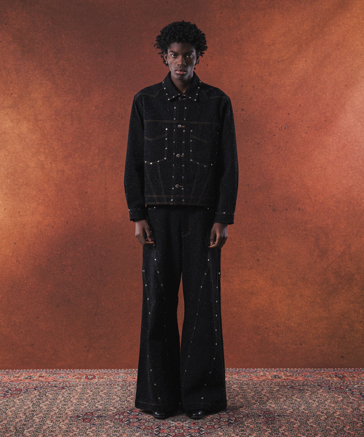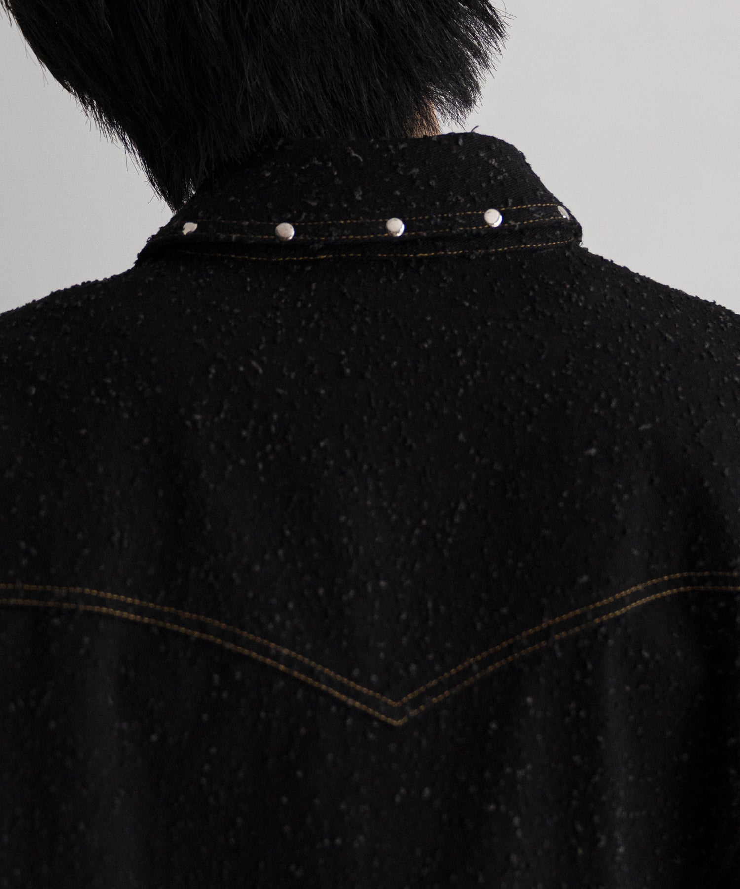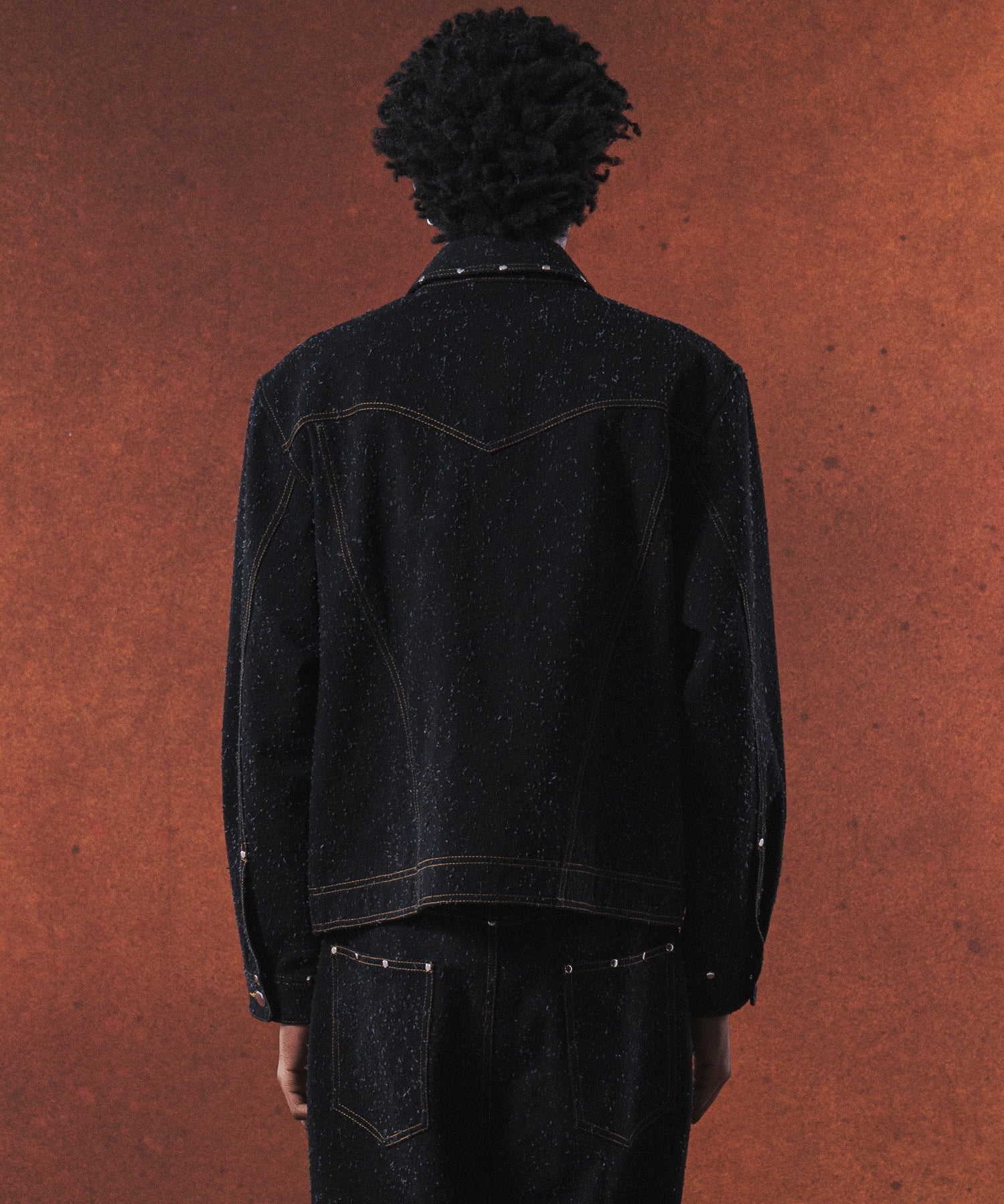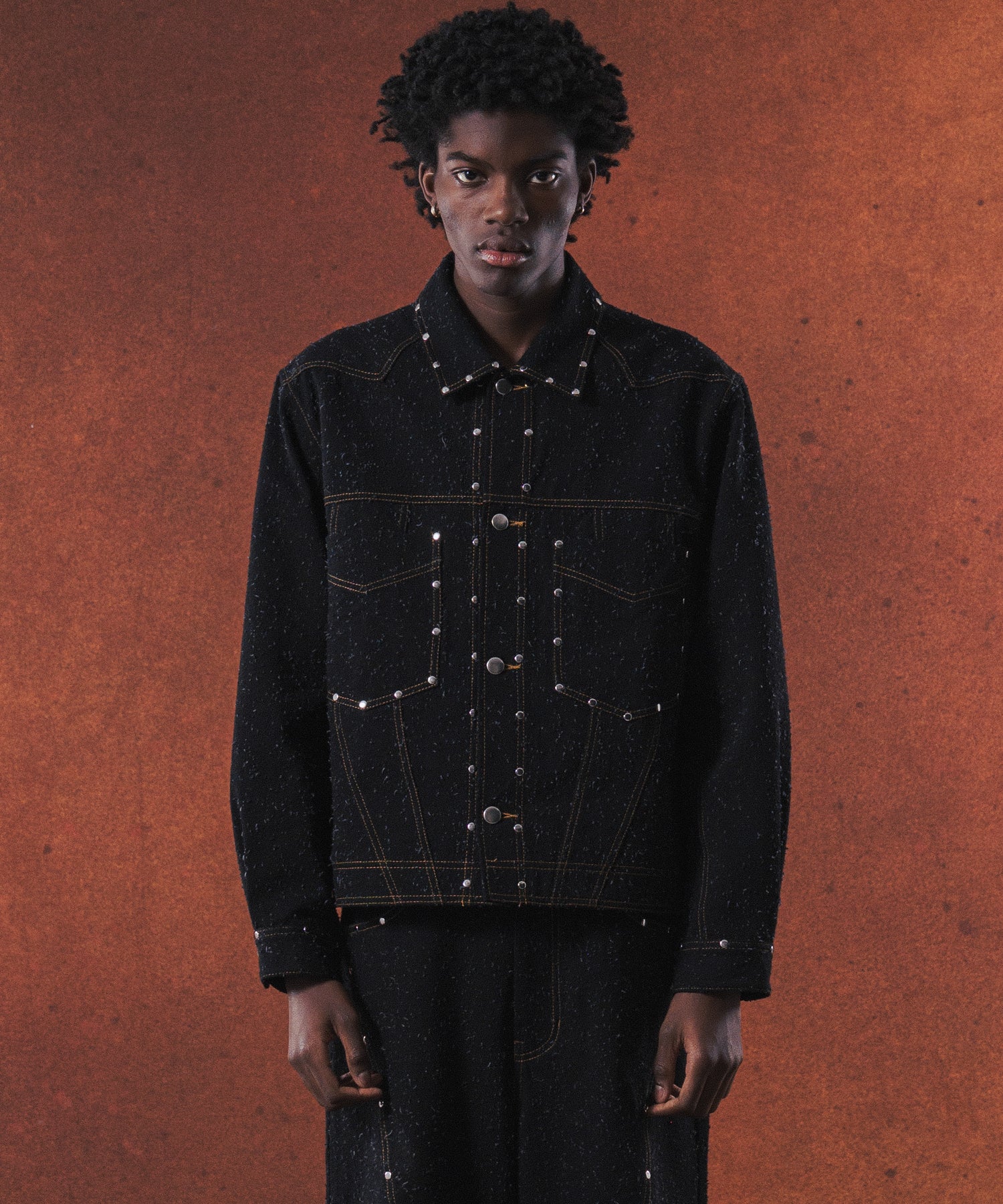 衿や前立て、ポケット部分に配されたスタッズデザインが目を引く存在感を放ち、他にはない個性的な一着に仕上がっています。