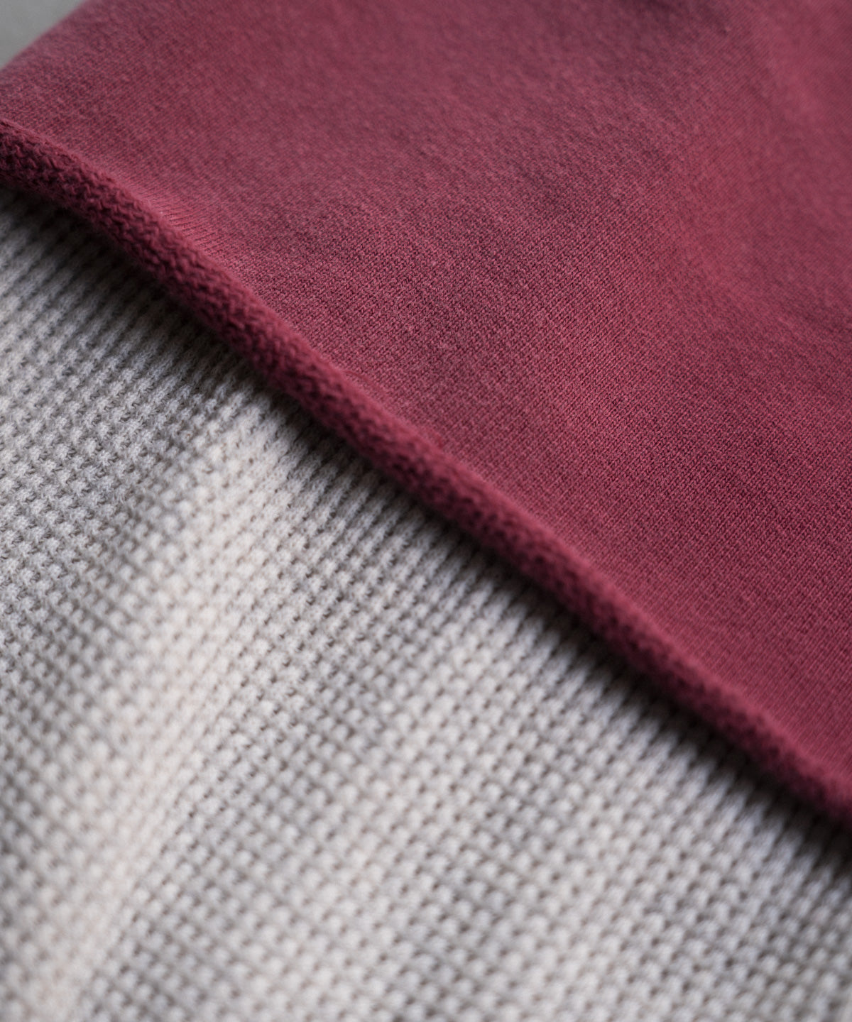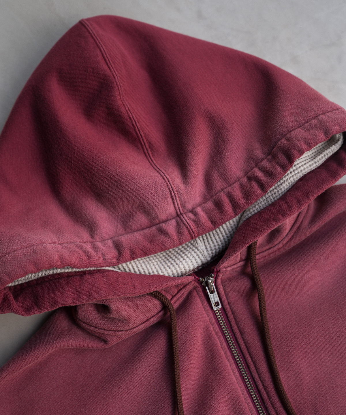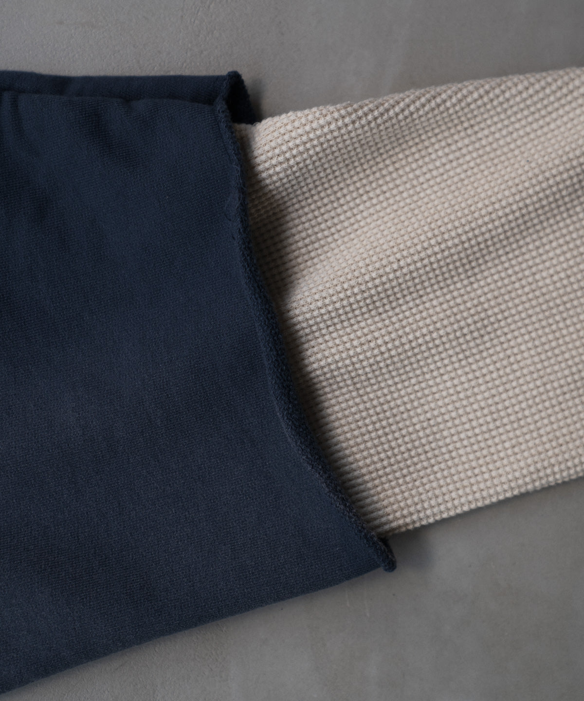 袖およびフード裏には空紡糸のサーマル素材を使用し、凹凸のある編み地がアクセントと保温性をプラス。