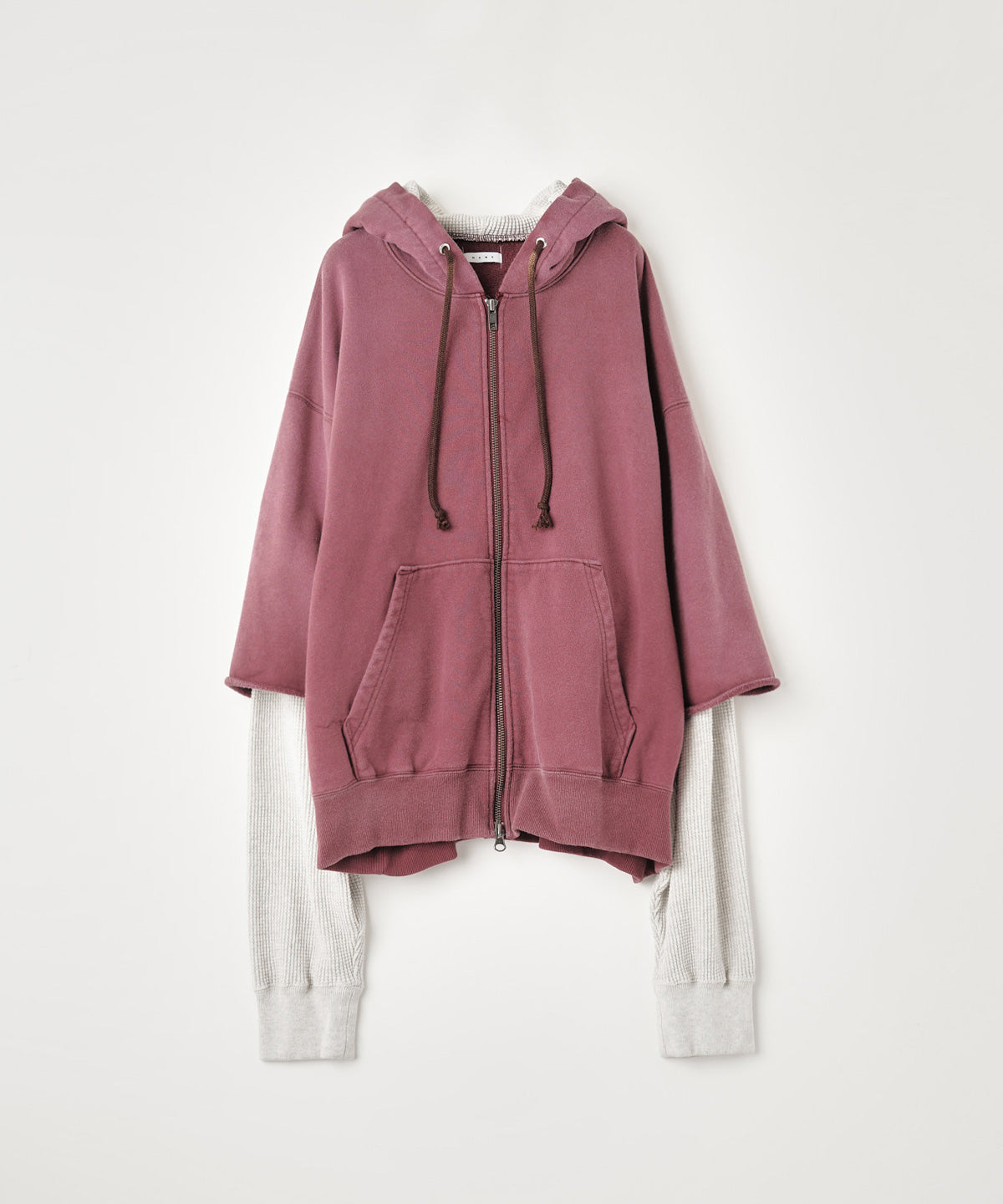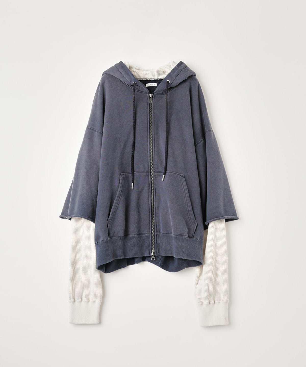 レイヤードスリーブが特徴的なジップフーディー。